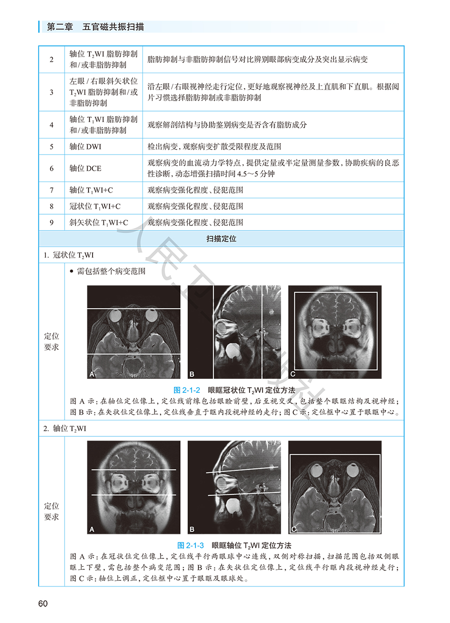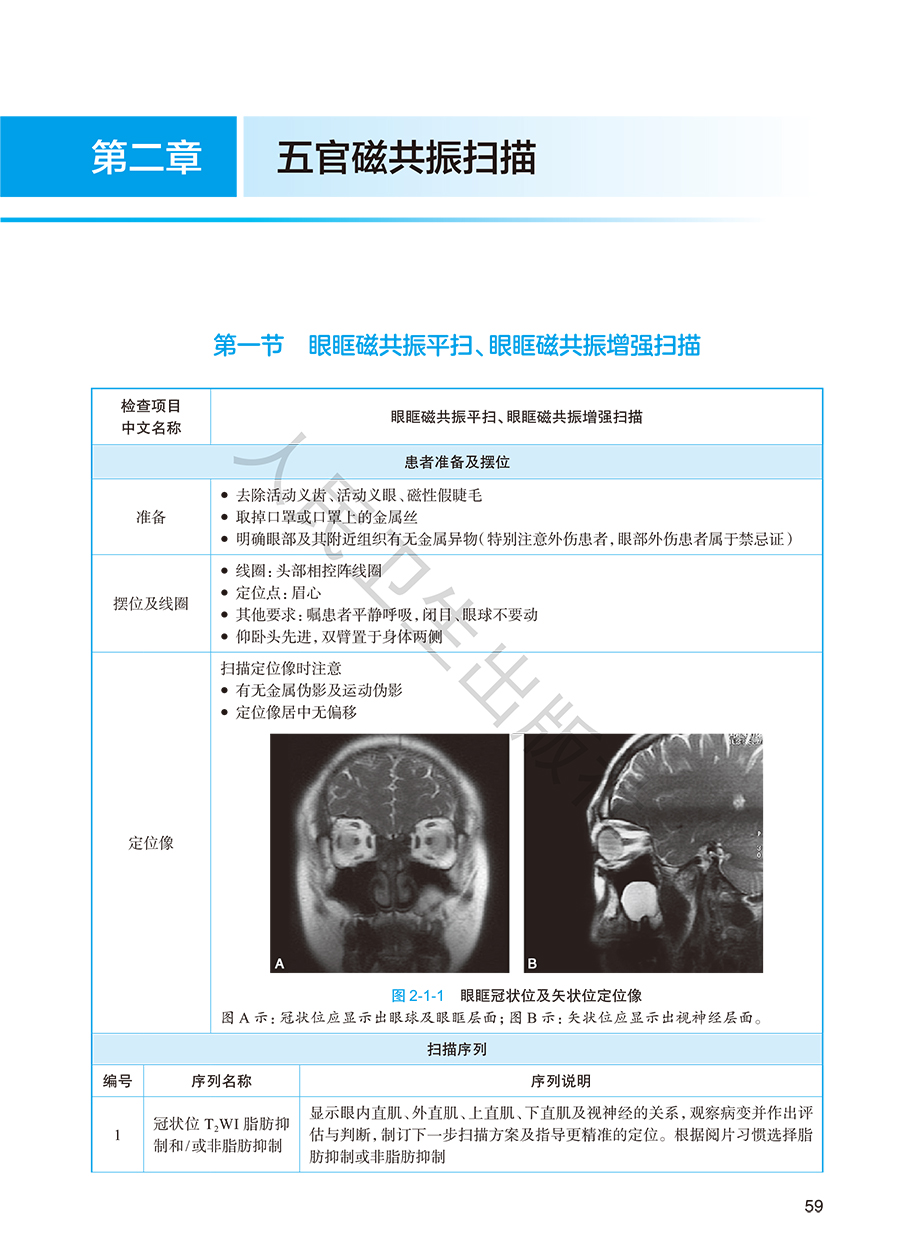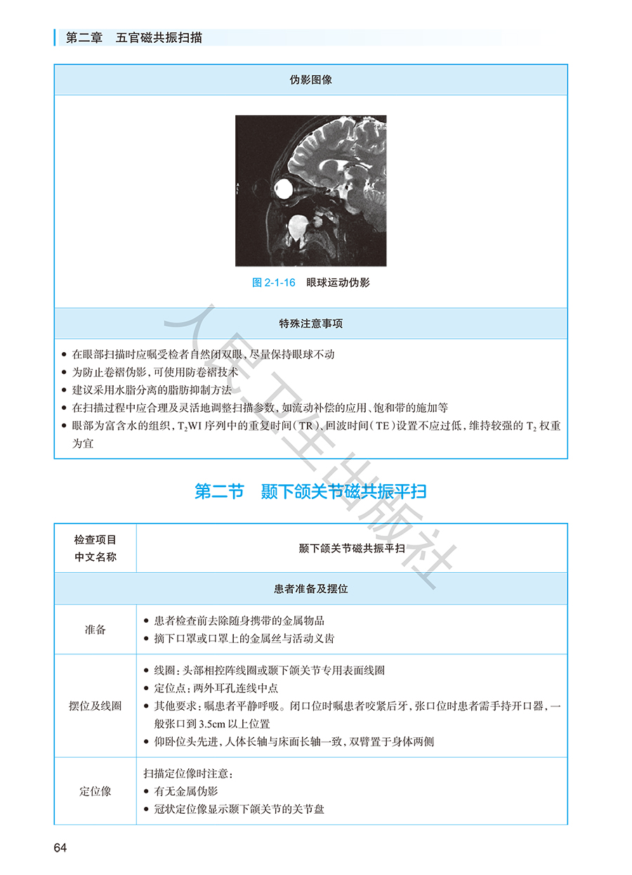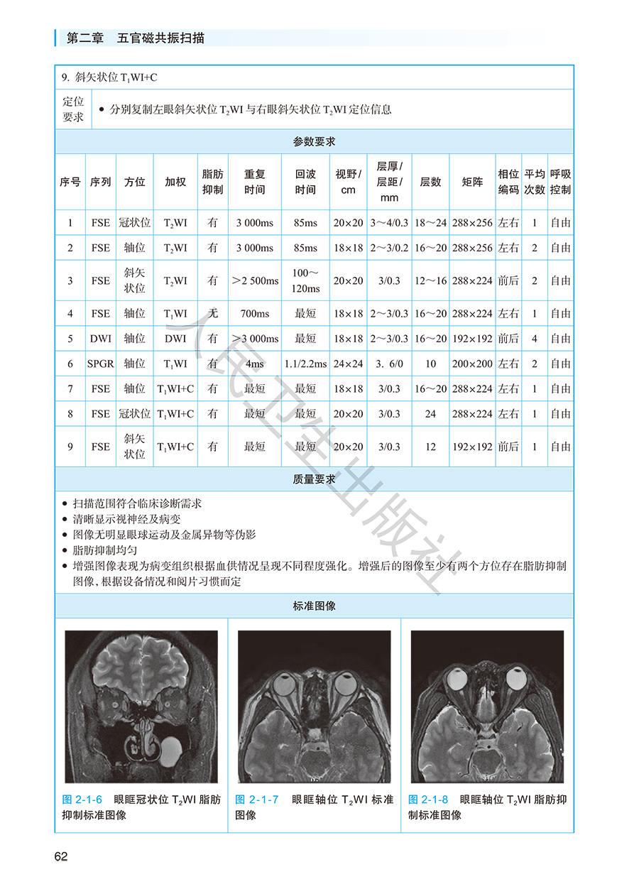 本分册除绪论外还包括九个章节,其中绪论介绍磁共振检查的基本原则,包括磁共振检查注意事项和注射对比剂注意事项;第一章到第九章分别是头部、五官、颈部、胸部、腹部、盆部、脊柱、四肢关节及软组织、心脏及大血管的磁共振检查技术规范,共96个临床检查项目,每个检查项目包括患者准备及摆位、扫描序列、扫描定位、参数要求、质量要求、标准图像以及临床应用中的注意事项等。