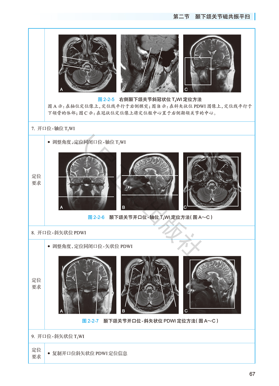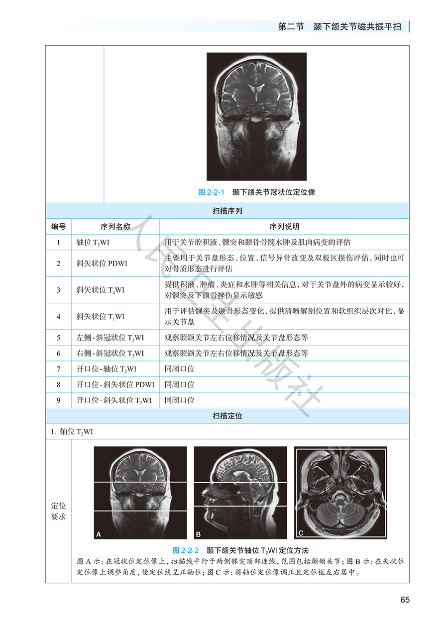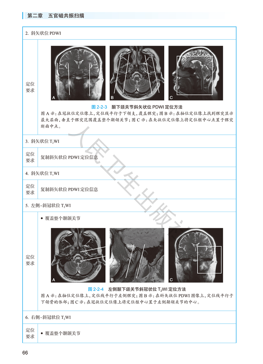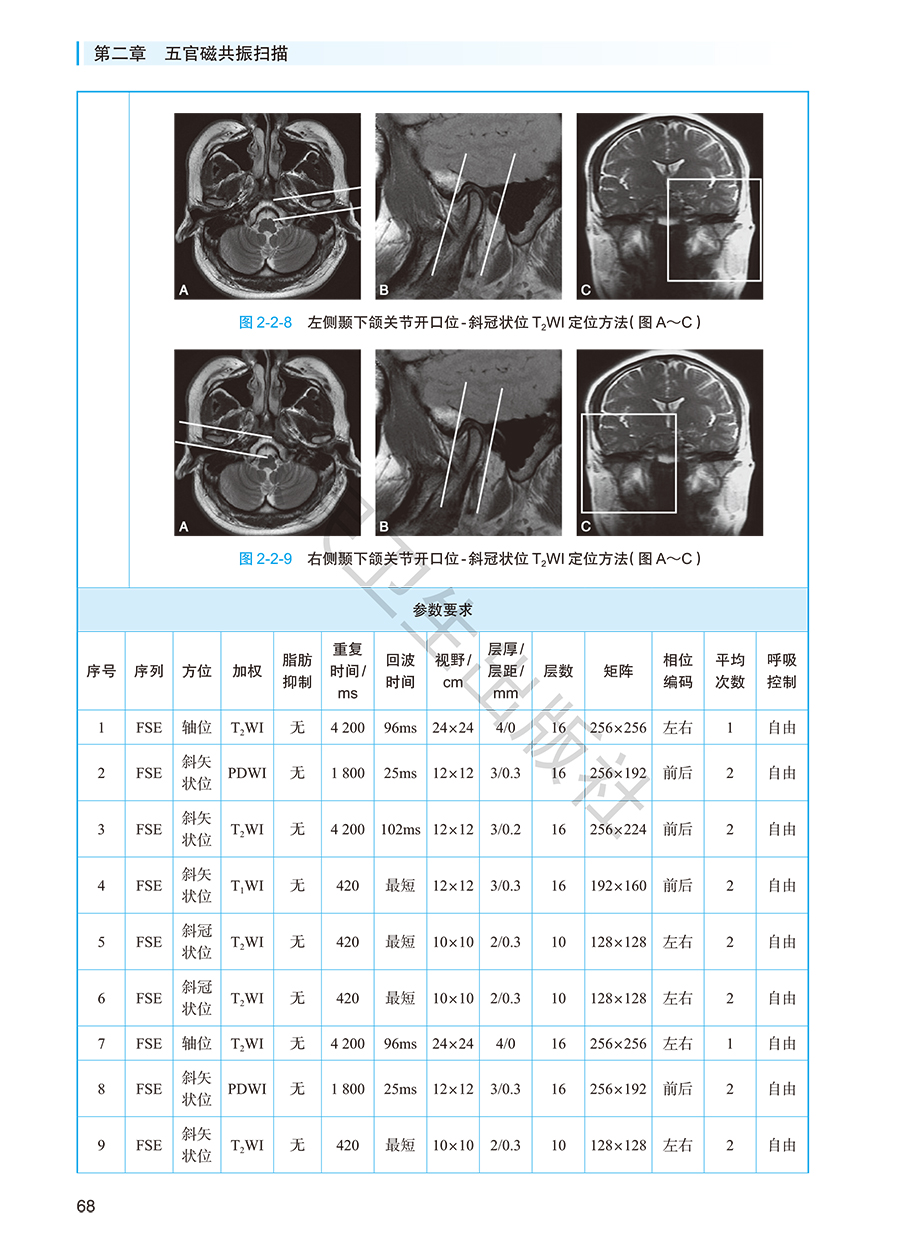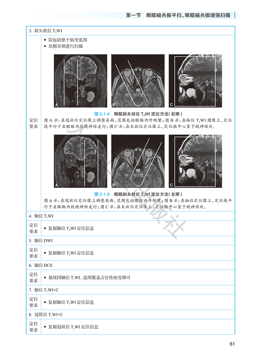 本分册除绪论外还包括九个章节,其中绪论介绍磁共振检查的基本原则,包括磁共振检查注意事项和注射对比剂注意事项;第一章到第九章分别是头部、五官、颈部、胸部、腹部、盆部、脊柱、四肢关节及软组织、心脏及大血管的磁共振检查技术规范,共96个临床检查项目,每个检查项目包括患者准备及摆位、扫描序列、扫描定位、参数要求、质量要求、标准图像以及临床应用中的注意事项等。