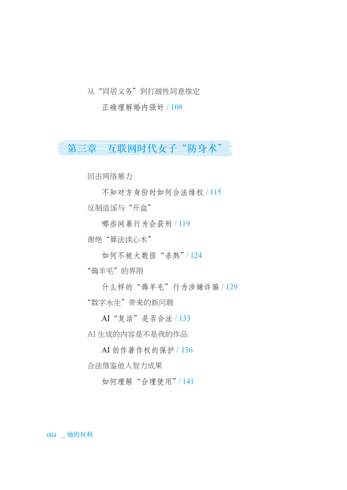 本书聚焦女性在职场、婚恋、互联网和消费四大核心领域中经常会遇到的法律困境,通过 70+则真实的案例,以通俗易懂的语言解析法律条文,让女性既能认清权利边界,又能掌握切实可行的维权方法。愿每位女性都能掌握捍卫自身权益的武器,在关键时刻敢于说“不”,让法律成为守护女性尊严与自由的坚实铠甲。