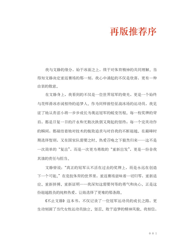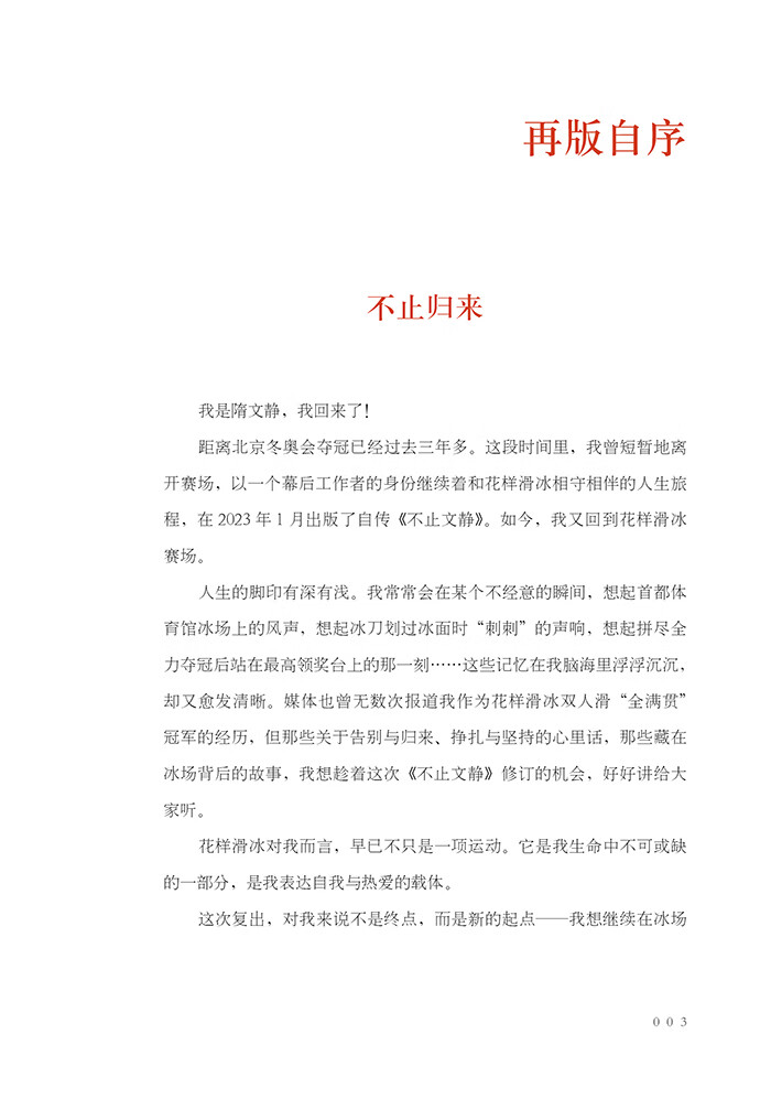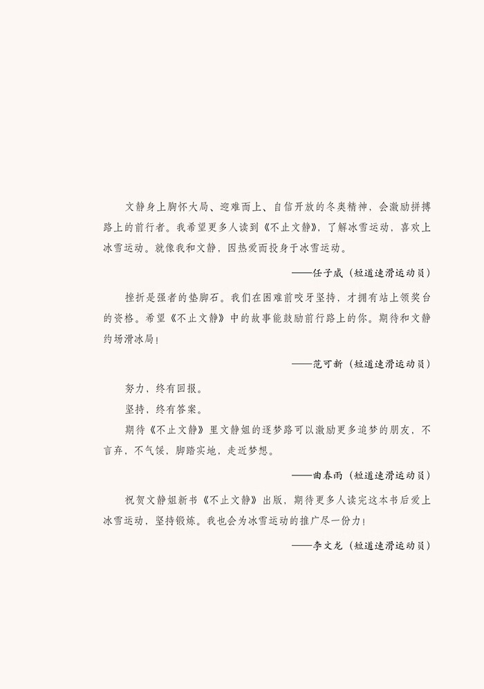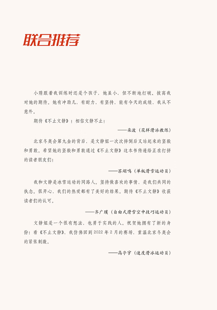 本书是北京冬奥会双人滑金牌获得者隋文静的自传。全书共分为四个部分:不止文静、北京冬奥日记、他们眼中的隋文静、附录(大事记、奖牌榜等),全面介绍了隋文静由一个热爱花样滑冰的哈尔滨小姑娘,一路成长拼搏征战,克服各种伤病和困难,成为北京冬奥会第九枚金牌获得者、双人花滑大满贯得主的经历,以及北京冬奥会后复出的筹备与心路历程。作者希望通过自身成长经历弘扬冬奥精神,推动冰雪运动在大众尤其是青少年群体的普及。