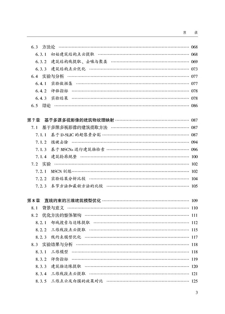 本书系统阐述了建筑物三维建模与智能提取的核心原理及关键技术,涵盖从多源影像处理到三维模型优化的完整流程。主要内容包括:多源多视影像的关联检索与匹配;建筑物遮挡检测与立面纹理智能提取;航空与地面协同三维建模方法;密集匹配算法优化与几何修复;基于无人机影像的建筑物智能提取;直线约束下的三维建筑模型优化。全书共10章,每章后有章节总结,便于读者把握重点。本书立足于当前建筑物三维建模与智能提取领域的新技术、新方法,系统解决了纹理映射、遮挡检测、立面提取等关键问题,突破了传统摄影测量几何约束的限制,显著提升三维建模效率与质量。