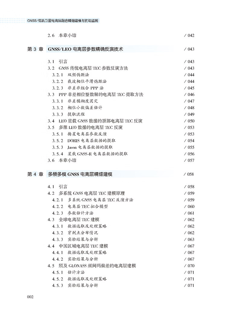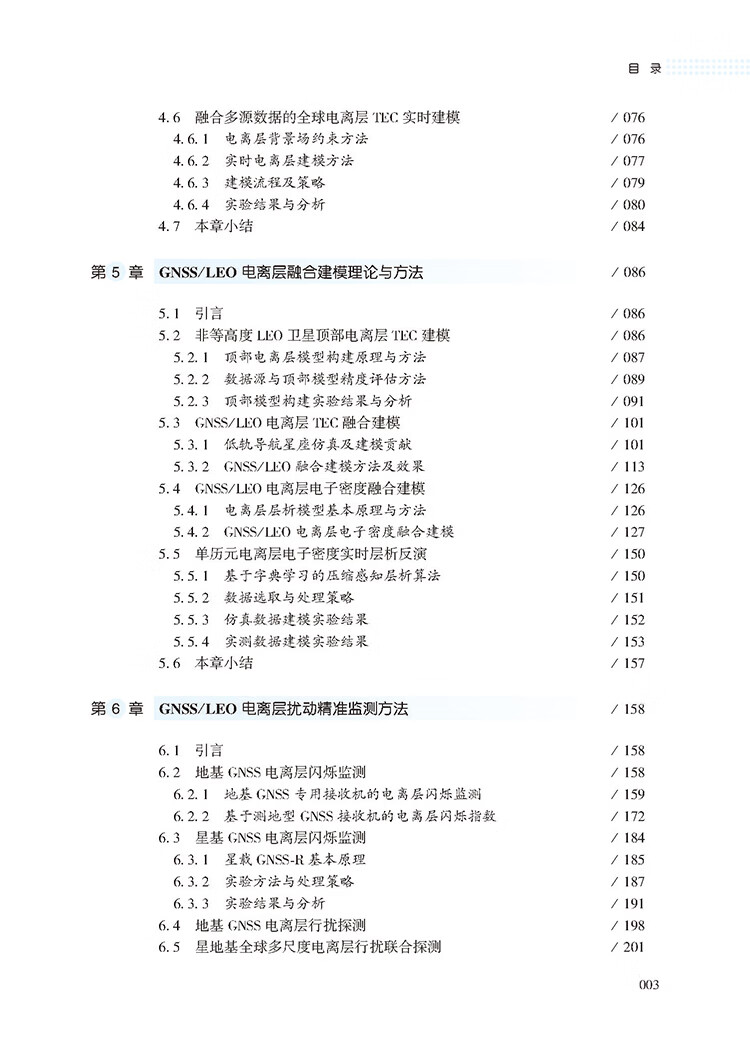 本书围绕多源异构电离层数据融合、非等高度LEO星座联合解算、电离层行扰与闪烁精细探测以及扰动环境下卫星精密定位误差补偿修正等关键问题展开深入研究。在方法层面,建立了从数据预处理到电离层精细建模的技术体系,发展了基于非差非组合精密单点定位(PPP)的电离层TEC提取技术;建立了面向LEO短弧段数据的模糊度固定方法;发展并提出电离层压缩感知三维层析算法,实现了电离层快速精细化建模。在应用层面,系统评估了多星座融合对全球/区域电离层模型的提升效果,验证了融合GNSS和LEO观测在提升模型精度和时空分辨率以及填补观测空白方面的优势;提出了面向PPP/PPP-RTK等精密定位服务的电离层扰动应对方法,提升了复杂空间环境下的卫星精密定位可靠性。
