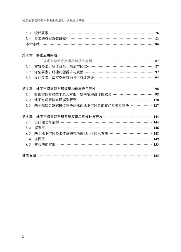 本书聚焦城市地下空间规划设计关键技术构建,涵盖从宏观到微观、理论到实践的全维度研究。首先通过梳理地下空间开发利用、规划布局及智能化设计发展现状,分析典型案例奠定研究基础。随后从宏观与微观层面研究地下空间布局形态与功能组合模式,系统性地提出前置、评估、设计三类布局要素。基于上述研究,构建地下空间智能布局模型,最终研发整合布局模式和关键要素的智能布局软件,为城市地下空间规划设计提供科学支撑。