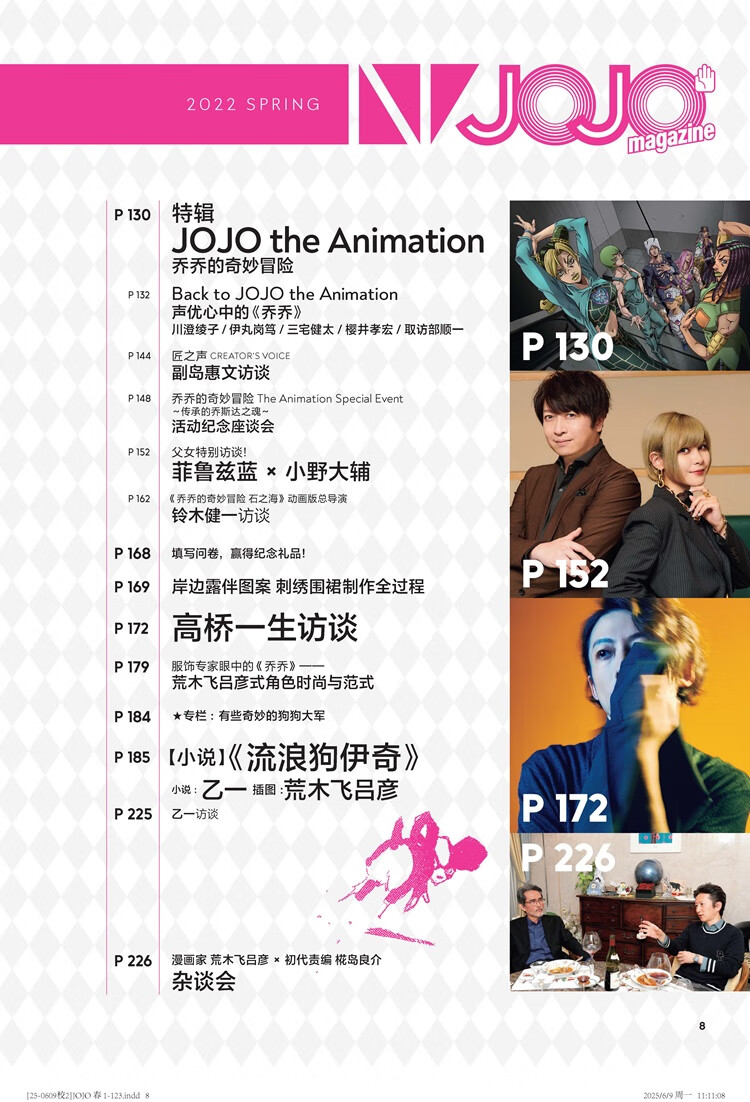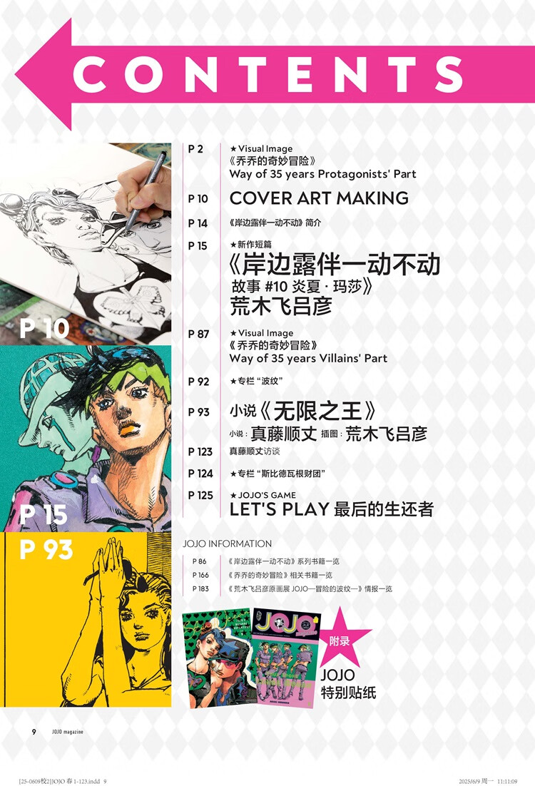 本书是集英社为配合JOJO系列连载35周年做的特殊企划。邀请了作者荒木飞吕彦执笔创作“岸边露伴”系列新漫画,同时采访了与动画创作相关的声优、制作人等,特别是承太郎和徐伦父女俩的特别企划,揭露了非常多制作内幕。除此之外,本杂志还收录乙一创作的衍生小说《流浪狗伊奇》片段,及高桥一生专访。