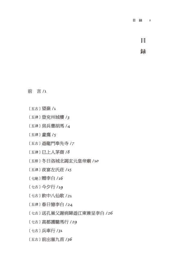 本書精選杜詩二百二十二題共三百首,佔全集總數的五分之一。其中五古五十五首,七古六十二首,五律五十七首,七律六十五首,五絶八首,七絶四十三首,五排十首。選詩以二王本《杜工部集》爲底本,參校古今注本,對異文擇善而從。詩題則針對某些誤將作者題注混入的情況作了釐正還原。標點衹用逗號和句號,避免引號、問號、感嘆號等主觀涉入。編次則綜合諸家,參酌新説,再斷以己意,並將寫作時間儘可能細化到春夏秋冬。