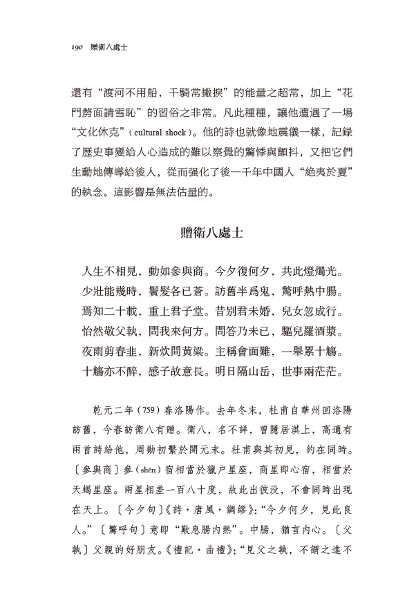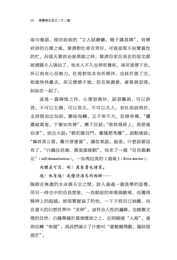 也許,這是本書不拘一格也别具一格的地方。我想要做的,是以古典詩學爲立足點,以現代詩學爲參照系,對杜詩給予新的解釋,將那些永恒的藝術品質擦亮、刷新、激活,把崇高的傳統與當代的寫作拉近一點,再拉近一點,非徒事掉文以炫惑衆目而已。因個人的才力所限,我衹能做到目前這一步,正期待更多的人,學人與詩人,用更多的粒子來對杜詩的原子核進行轟擊,産生無窮的裂變。