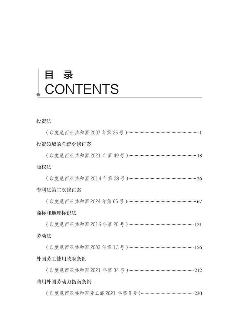 本书是一部全面介绍印度尼西亚相关商业与投资法律的资料汇编。本书汇集了印尼劳动法、有限责任公司法、投资法、电子交易和信息法及其修订法令、环境保护与管理法、版权法、专利法、商标和地理信息标志法、矿产和煤炭矿业法、外国劳动力使用政府条例、劳工部聘用外国劳工指南、民法典以及管理权、土地权利、单元式住宅和土地登记政府条例等重要法律法规,向读者呈现了一幅关于印尼外商投资领域的法律制度全景图。本书适用于有意或已在印尼投资的中资企业及其员工、专注于国际投资和东南亚市场的法律专业人士、涉及经贸和投资领域的决策者,以及印尼语或法律相关专业的学者和研究人员。