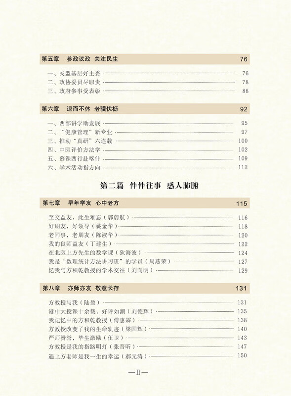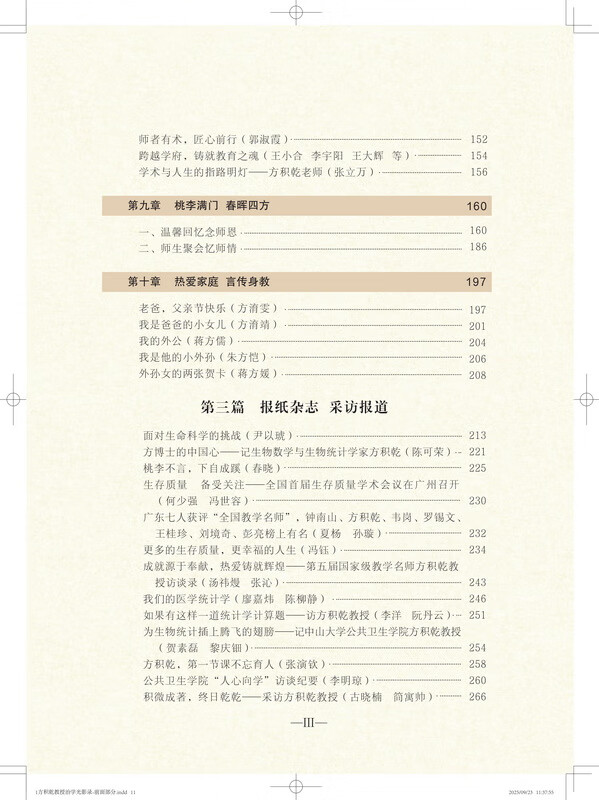 《方积乾教授治学光影录》分为三大部分,内容丰富翔实,不仅记述了方积乾教授的个人经历,更是一部微观的中国生物统计学发展史。第一部分详述方教授从复旦求学到医学领域探索,再到国际学术舞台的治学之路,展现他在生物统计、卫生统计等领域的卓越成就,亦串联起学科从引进到本土化的关键节点;第二部分通过师友、学生及家人的回忆,勾勒出方教授立体鲜活的人物形象,其中提及“全国卫生统计师资培训班”细节,具象化了学科人才培养的早期实践;第三部分媒体报道里的学术会议记录,则折射出学科国际话语权的逐步提升。